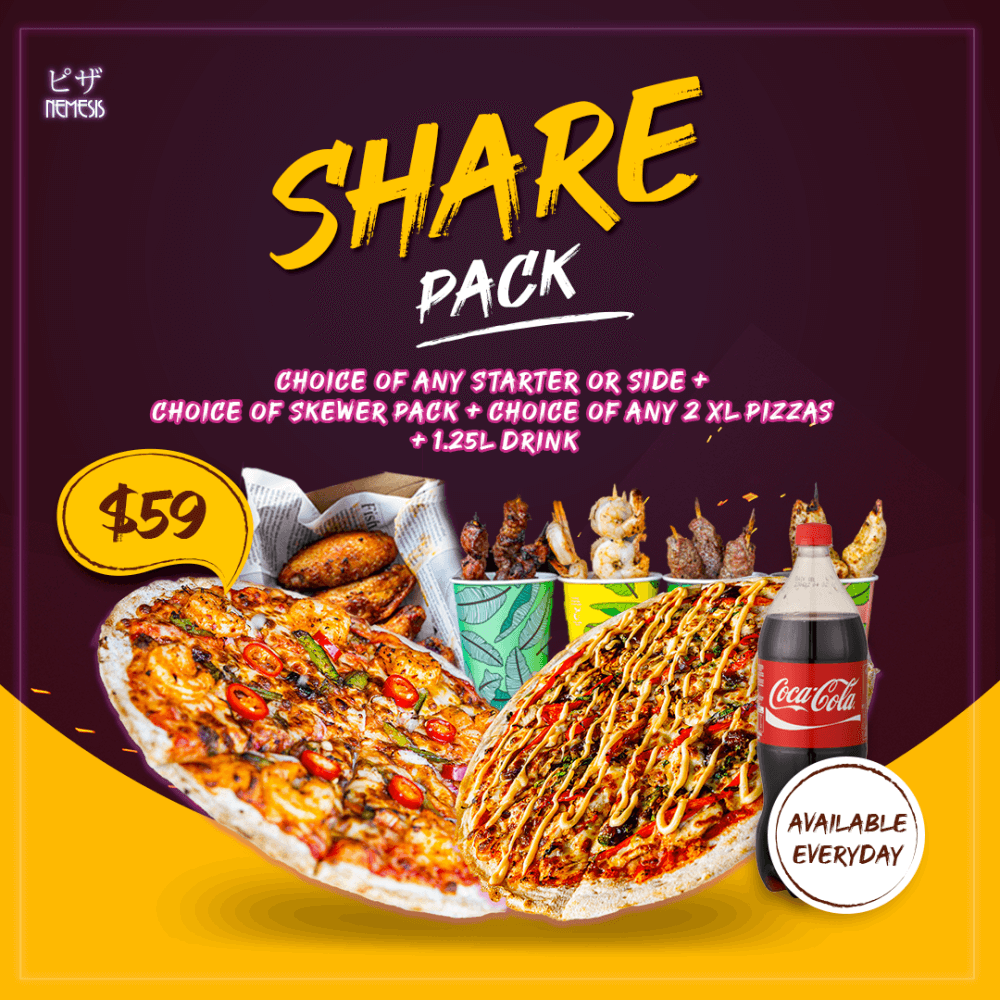 Choice of Any 2 XL Pizzas, Choice of Any Starter or Side, Choice of Skewer Pack and 1.25L Drink