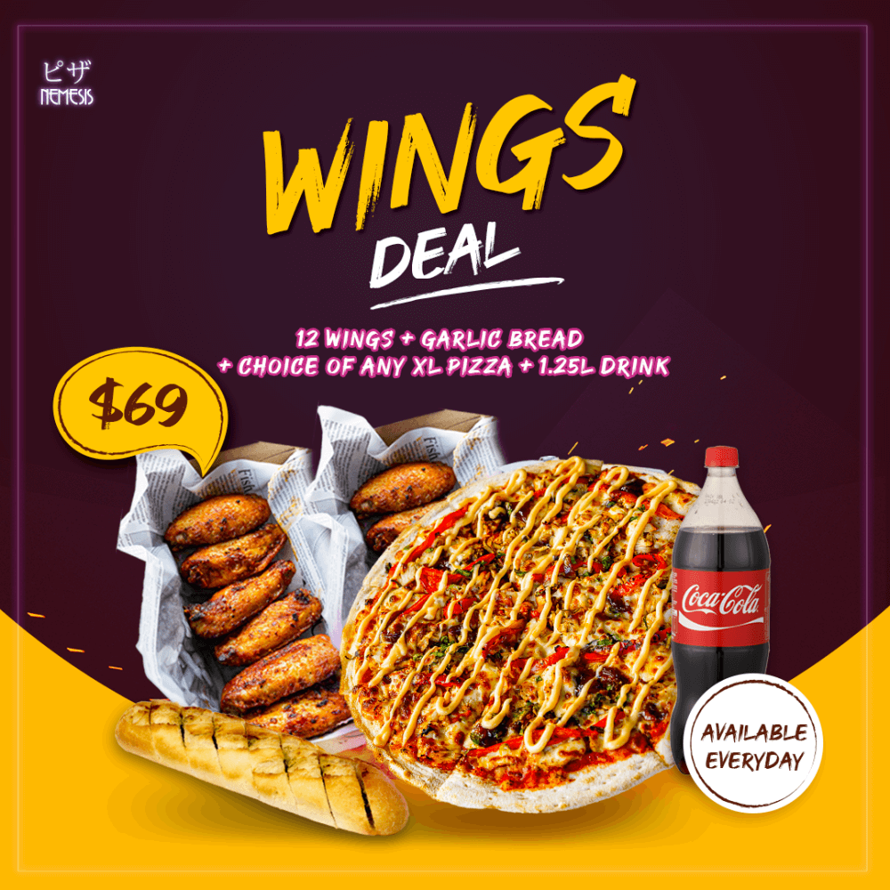Available Monday - Thursday 12 Wings, Garlic Bread, Choice of XL Pizza and 1.25L Drink